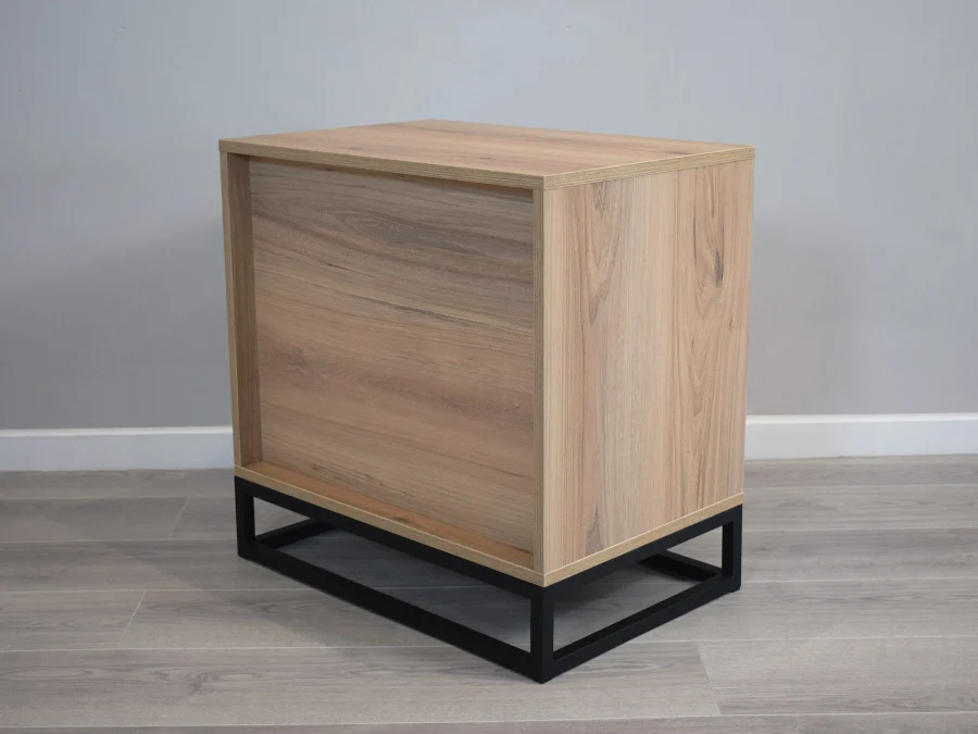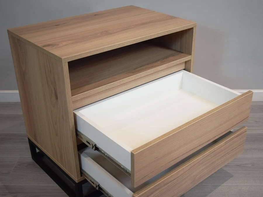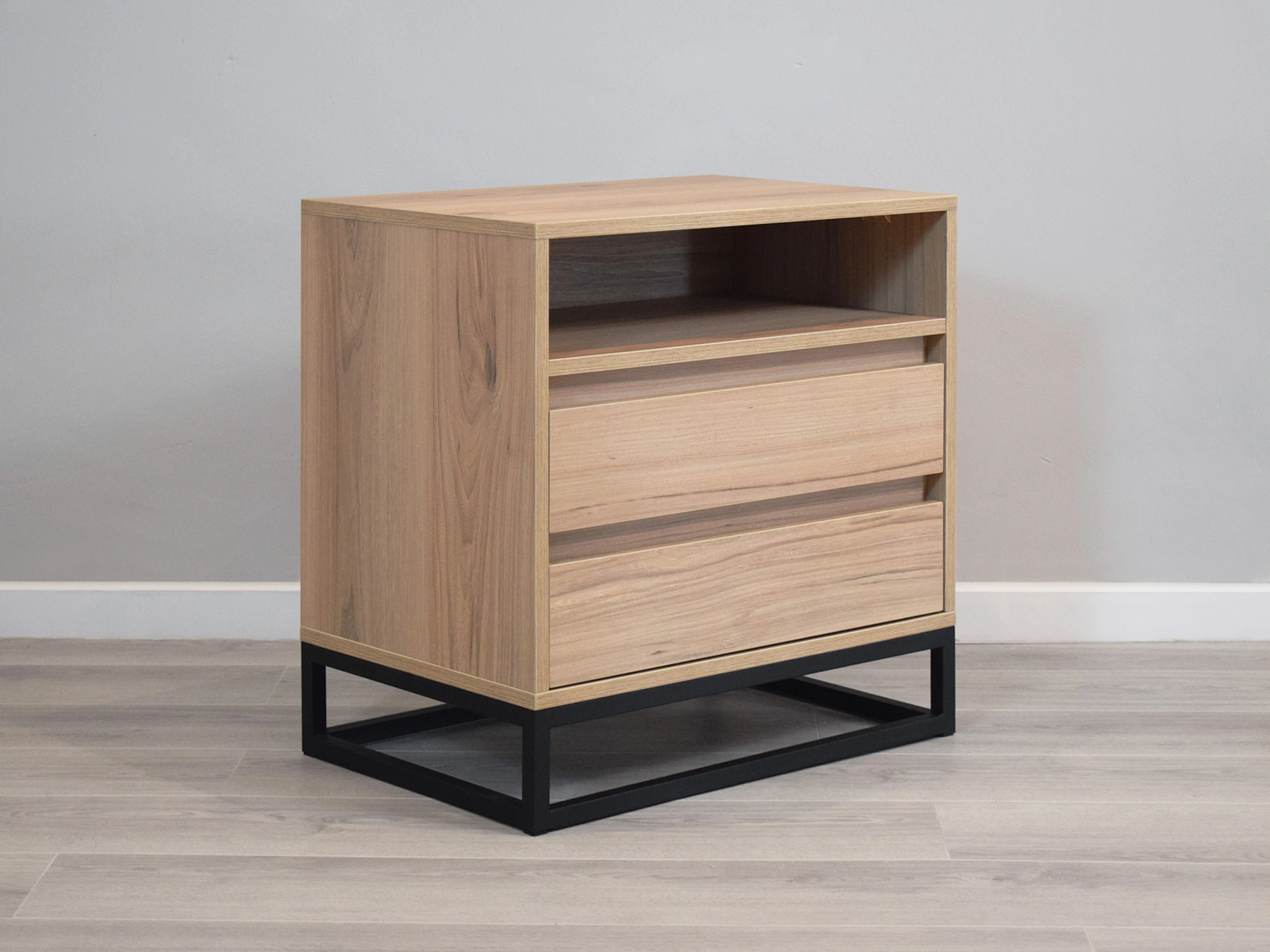 A luxurious, designer bedside table featuring a storage shelf, two sleek, smooth-gliding drawers featuring handle-free finger grips. Tall enough to compliment any thick mattress bed on base. The steel frame on which it stands is powder coated professionally.